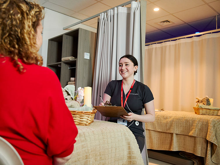 A smiling student stood with a clipboard looking at a client